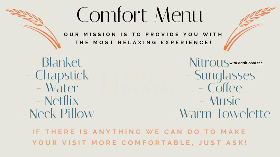 At Harvest Dental, we understand that coming to the dentist can be anxiety-inducing for many. Therefore, we have many options to make your visit a little more comfortable: